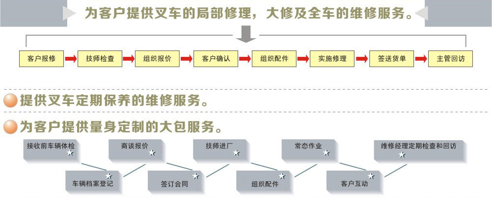 "精益求精"是我司服務(wù)客戶的主要信念。我司擁有600多名訓(xùn)練有素的維修工程師,維修服務(wù)團(tuán)隊強(qiáng)大。目前,我司還擁有160多名各類高級維修工程師,可全方位的為客戶提供日系,歐美系內(nèi)燃叉車、、電瓶叉車的維修服務(wù)及故障解決方案。公司定期在國內(nèi)舉辦技術(shù)研修課程,以確保維修服務(wù)人員得到最新的產(chǎn)品知識和技能學(xué)習(xí)。