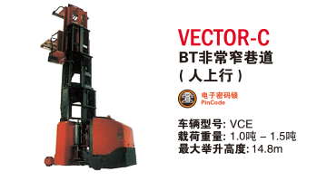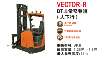 BT非常窄巷道BT VECTOR C系列人上型車擁有鉸鏈底盤,即使在非常狹窄的巷道里也可以實現(xiàn)最佳的機動性和穩(wěn)定性,為高位全托盤搬運和揀選作業(yè)提供高效解決方案。